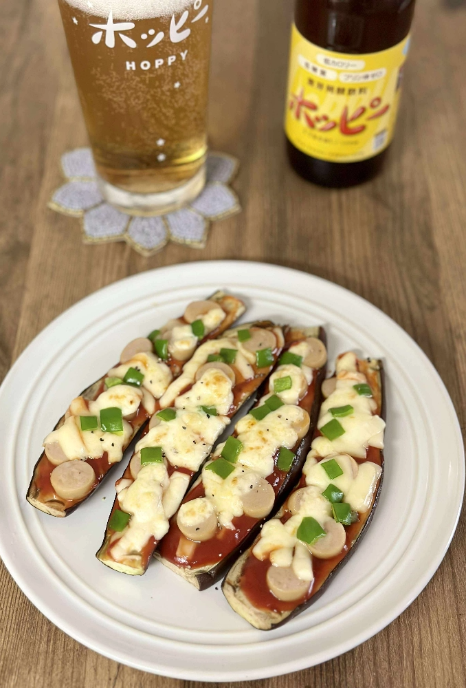 長なすを縦方向に4等分にし、魚焼きグリルに並べ、3〜4分ほど表面を焼いて裏返したら、魚焼きグリルから、いったん取り出し、表面にケチャップを塗り、Aをトッピングし、全体にハーブソルトをまぶし、魚焼きグリルに戻し、チーズがこんがり溶けるまで焼いて器に盛り付ける。