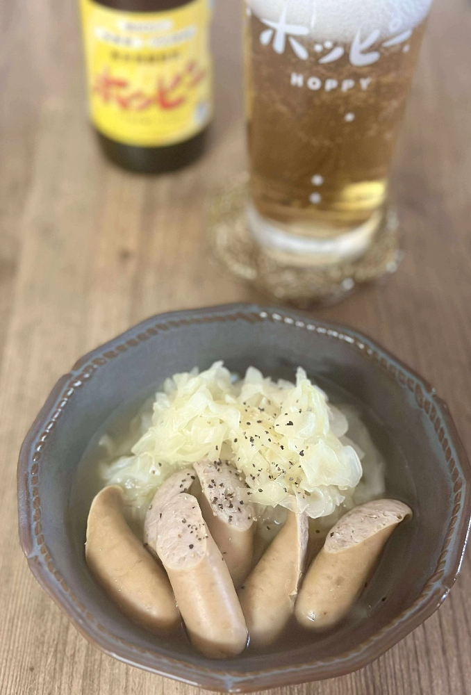 5ミリ程度の千切りにしたキャベツとAを小鍋に入れて火にかけ、沸騰したら弱火でキャベツがしんなりするまで3分ほど加熱し、斜め切りにしたソーセージを加えてさらに1〜2分、煮込み、天然塩で味を整え、器に盛り付け、粗挽き黒胡椒をトッピング。