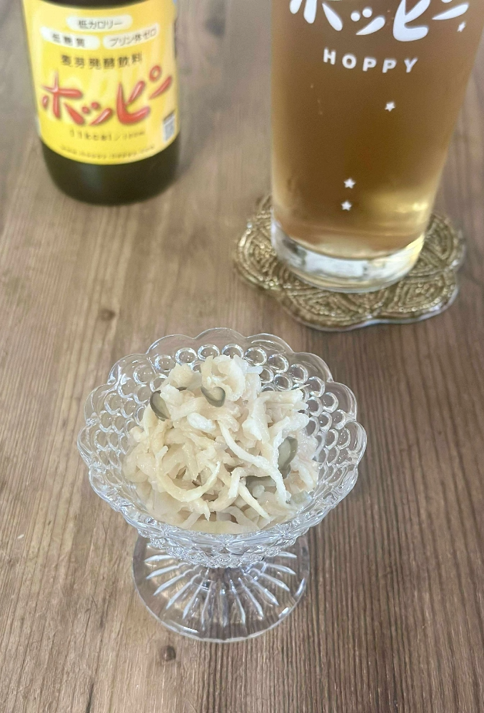 切り干し大根をたっぷりの水で戻して水洗いし、水気をしっかり絞り、わさび漬けと合わせる。
