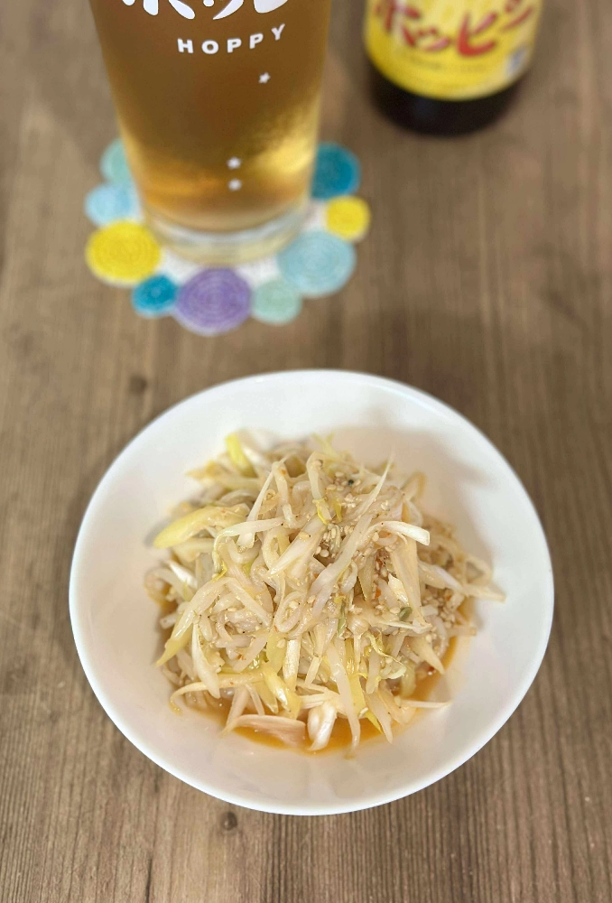 熱湯で茹でてしっかり水気を絞ったもやしと、細切りにした長ネギをAと合わせて器に盛り付ける。