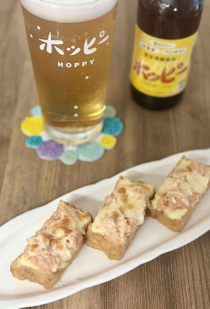 熱湯で茹でて表面の水気を拭いた厚揚げを3等分し、両面を魚焼きグリルなどで焼いたら、Aを3等分してトッピングし、チーズが溶けてこんがり焦げるまで焼いて器に盛り付ける。