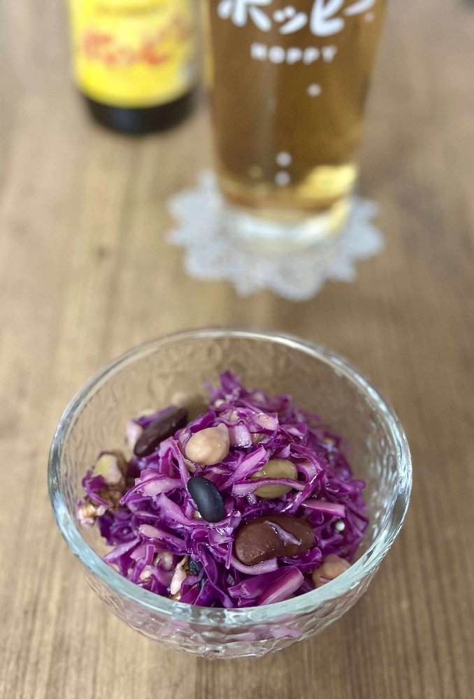 レッドキャベツは2㎝程度の長さの細切りにし、食品用の清潔なビニール袋に入れて、Aと合わせ、よく揉み込み、空気を抜きながらビニール袋を閉じ、1時間ほど冷蔵庫で寝かせたら、袋を開けて、キャベツをぎゅっと絞りながら水気を絞り捨て、Bと合わせ、Cで味を整える。