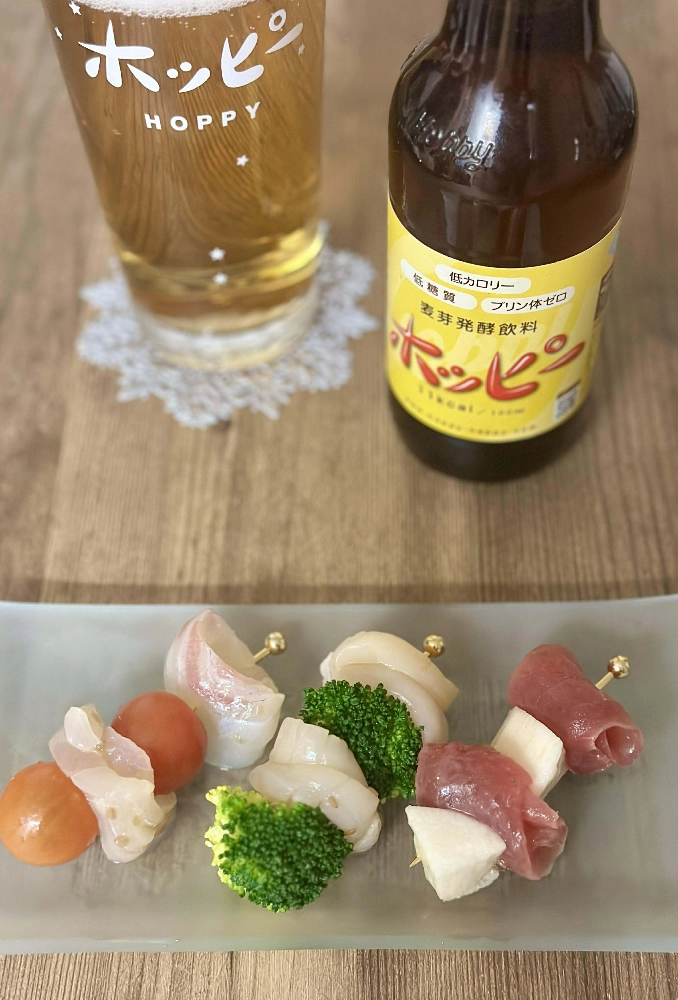 A、B、Cをそれぞれ、ドレッシングで合わせ、串に刺し、器に盛り付ける。